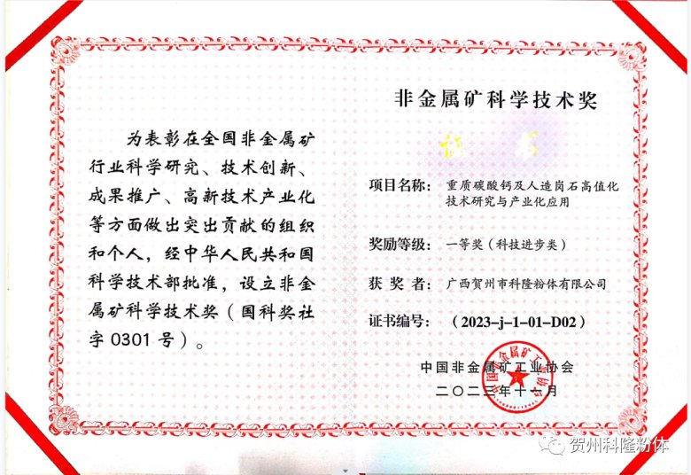 近日,2023年中国非金属矿工业大会在连云港召开,会上宣布了“2023年度非金属矿科学技术奖”的评审结果,并举行了颁奖仪式。科隆公司“重质碳酸钙及人造岗石高直化技术研究与产业应用”项技术成果,荣获2023年度“非金属矿科学技术奖”科技进步类一等奖!“非金属矿科学技术奖”是由中国非金属矿工业协会设立承