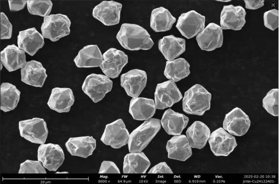1-5微米亚微米铜粉:光伏银包铜导电的“低成本革命” Cu粉扫描电镜图(SEM) 亚微米铜粉介绍亚微米铜粉是指粒径在100纳米—5微米范围内的超细铜颗粒,具有高纯度(≥99.9%)、高球形度(>98%)和低氧含量(<800ppm)等特性。其表面可通过化学镀银、包覆改性等工艺,形成“铜核银壳”结构,
