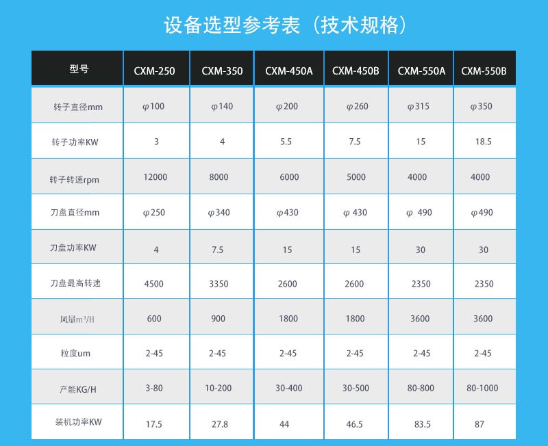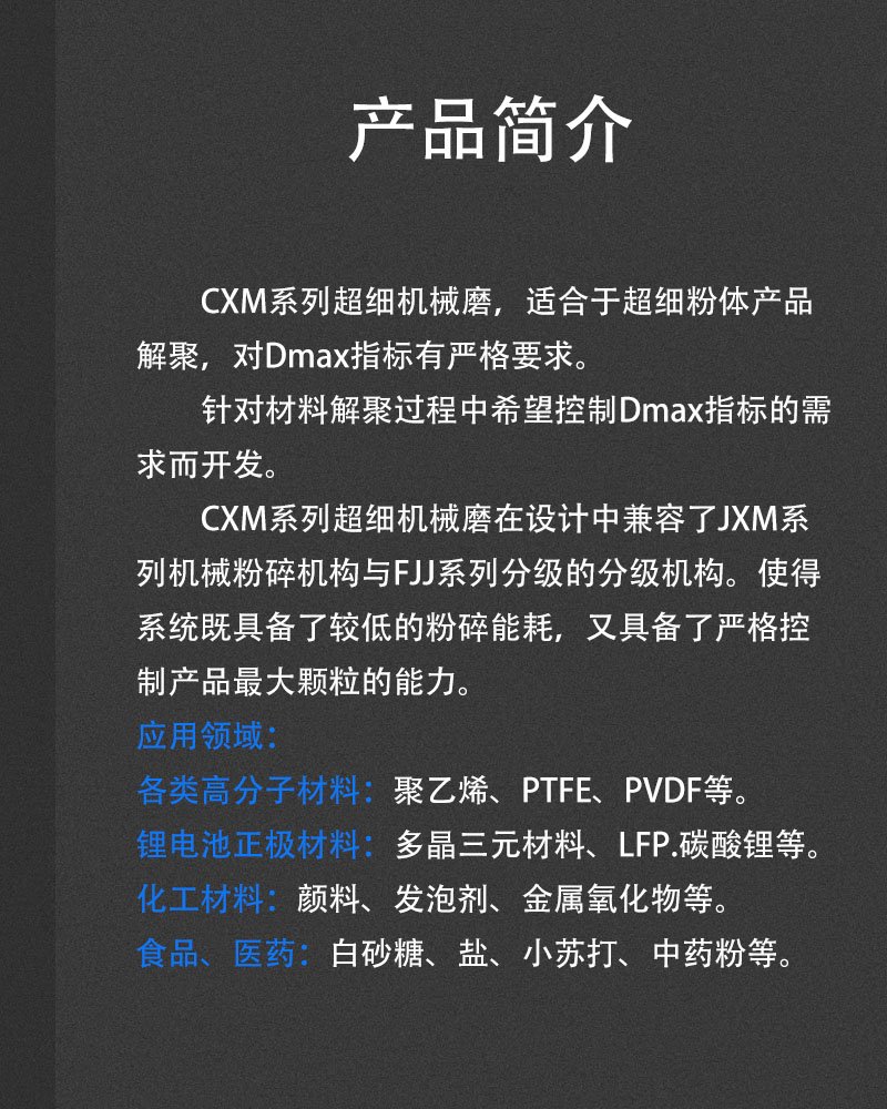 CXM系列超细机械磨在设计中兼容了JXM系列机械粉碎机构与FJJ系列分级机的分级机构。使得系统既具备了较低的粉碎能耗,又具备了严格控制产品更大 颗粒的能力。