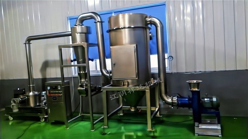 是一种立轴反射型微粉碎机,能同时完成微粉碎和微粉分选的两道加工工序。它由机体、机架、喂料装置、粉碎装置、出料管、传动装置和电机等组成,配套由主机、除尘器、高压离心风机、关风器、旋风集料器和电控柜等组成整套气流涡轮微粉机组。在不停机的情况下,可任意调节粒度。产品粒度均匀,细度可达10-5um,该机具有自冷却功能。