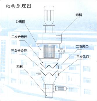气流分级机也叫选粉机,与旋风分离器、脉冲除尘器、引风机、控制柜组成一整套分级系统。物料在风机抽力作用下随上升气流运动至分级区,在高速旋转的分级涡轮产生的强大离心力作用下,使粗细物料分离,符合粒度要求的细颗粒通过分级轮进入旋风分离器和除尘器收集,粗颗粒夹带部分细颗粒撞壁后速度下降,延筒壁下降至二次风口处,经二次风的强烈淘洗作用,使粗细颗粒分离,细颗粒上升至分级区二次分级,粗颗粒下降至卸料口处排出。