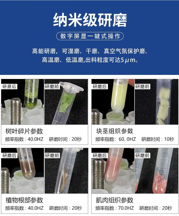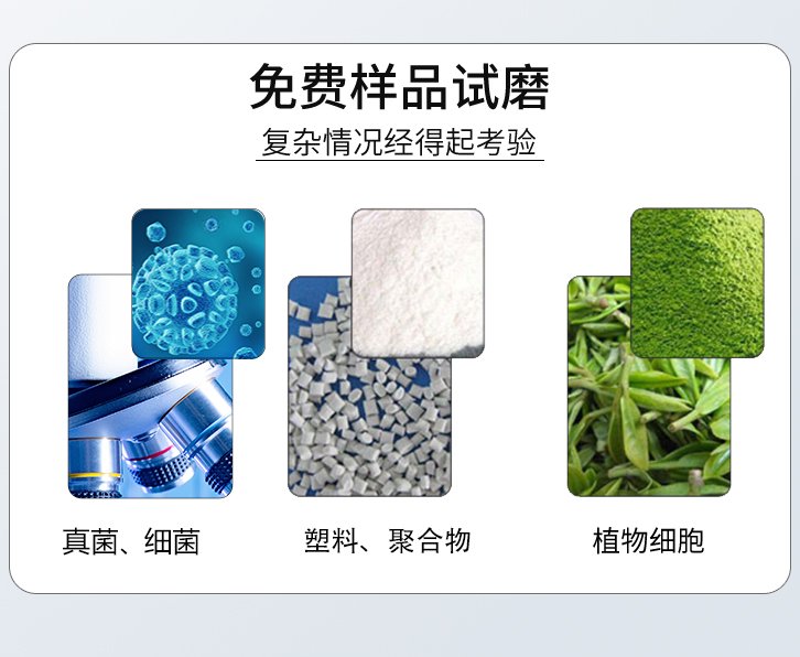 高通量组织研磨仪(高能球磨机)的研磨罐是在水平方向上进行振动的,研磨球的惯性带动它们以高能量撞击位于弧形内表面的样品材料,从而达到粉碎效果。高通量组织研磨仪是专门为处理实验室少量样品而研发的产品。其不仅适用于对硬性、中硬性和脆性样品的细粉碎和精细研磨,还适用于软性、弹性、纤维质、生物材料医药等行业。其只需要几十秒种的时间就可以达到对样品研磨、混合、均相化的目的。