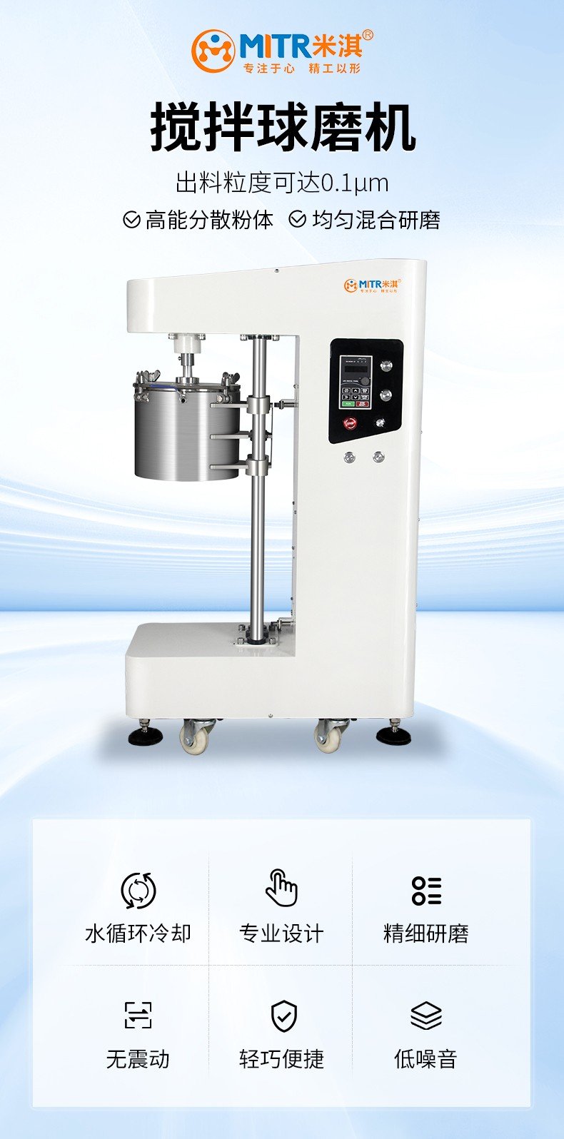 桶体固定不动,搅拌器发挥强有力的作用,故可在不停机的情况下进行抽样检验和添加磨料。可以使用两种或多种不同的物质在彼此之中互相分散,从而达到均匀混合,也可以加速传热和传质;实现高能水冷循环、无污染、分散均质化、研磨混合。