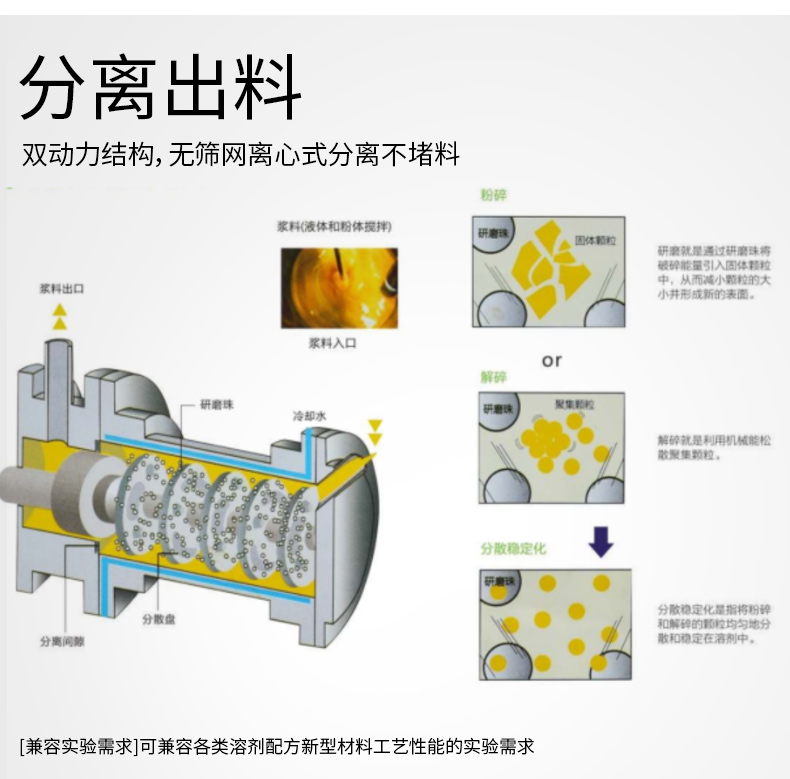 升级版棒销研磨结构,动力更强,转速高,运行稳定可靠。 动态筛网系统,流量大不堵塞。加强了研磨介质对物料的撞击和剪切作用,散热性能好。适用于分散难度高的物料研磨及微米级物料的高效率研磨。
