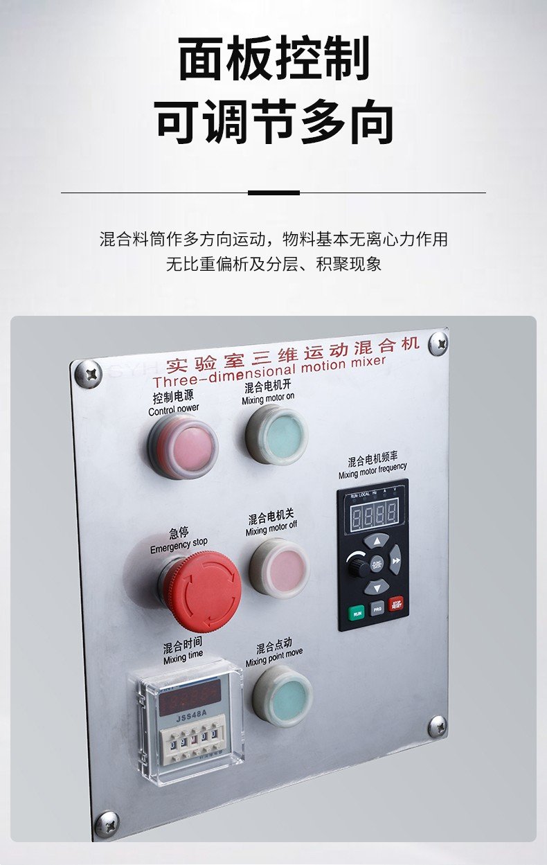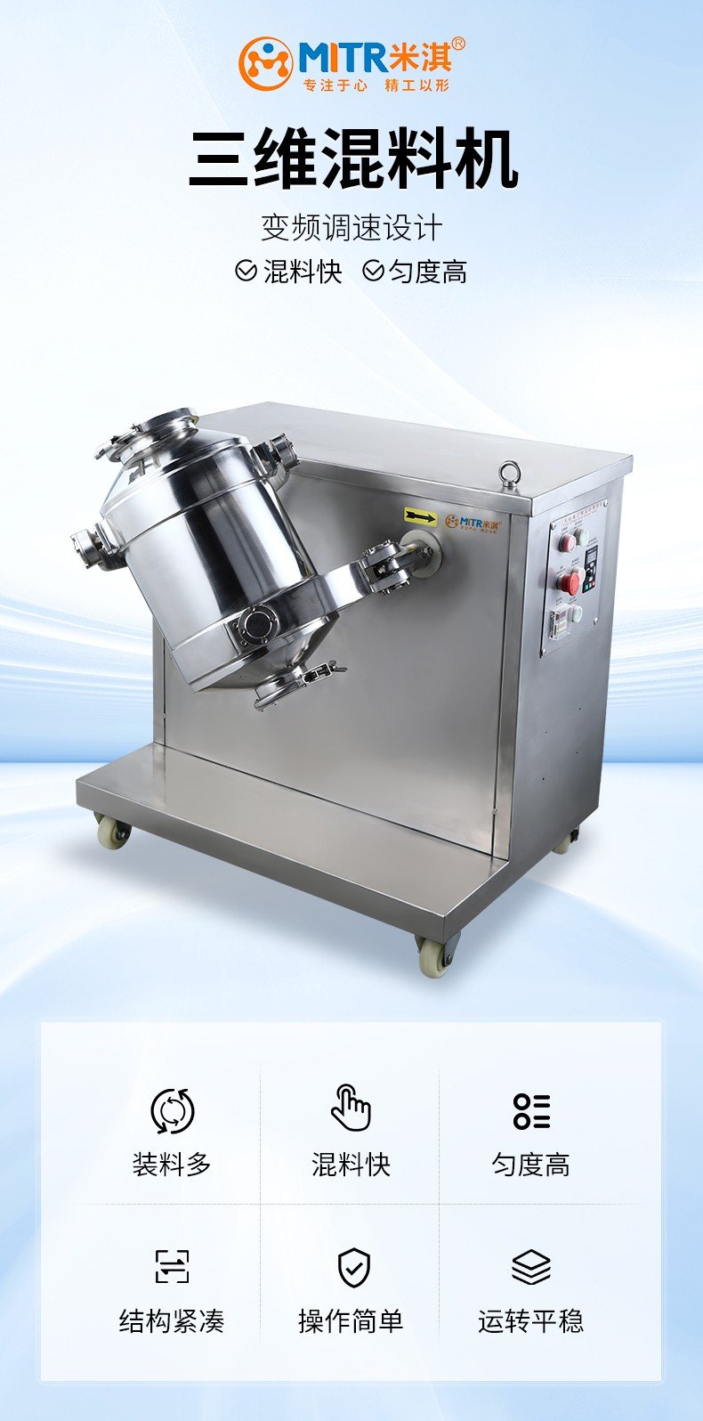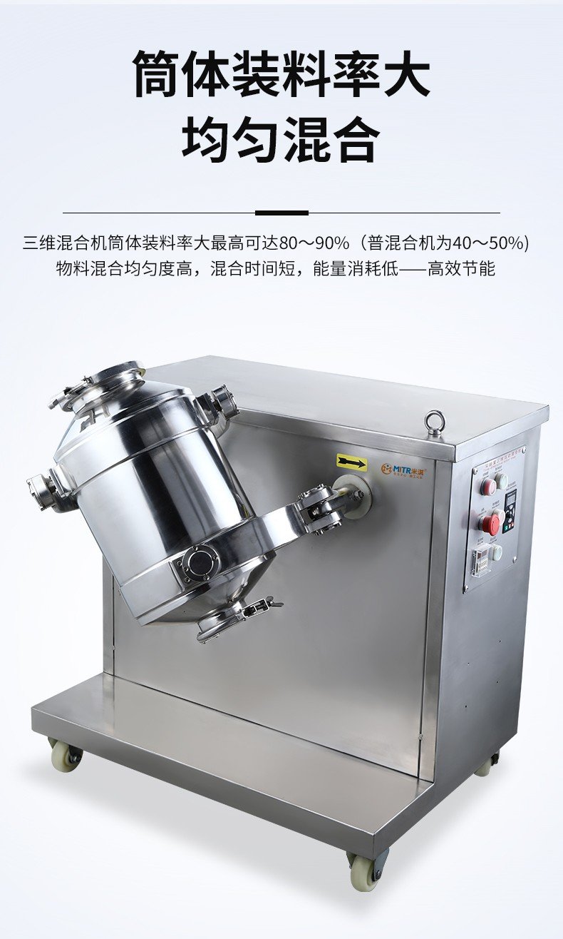 三维运动混合机广泛应用于制药、化工、食品、轻工、电子、机械、矿冶、国防工业以及各种科研单位的粉状、颗粒状物料的高效混合。三维混合机是通过混合筒空间上的三维运动,来消除物料因离心力作用产生的比重偏析,分层,积聚现象,实现多种物料之间相互流动,扩散,从而达到快速、均匀地混合物料。目前各类混合设备中,三维混合机是各方面性能较理想的先讲产品。