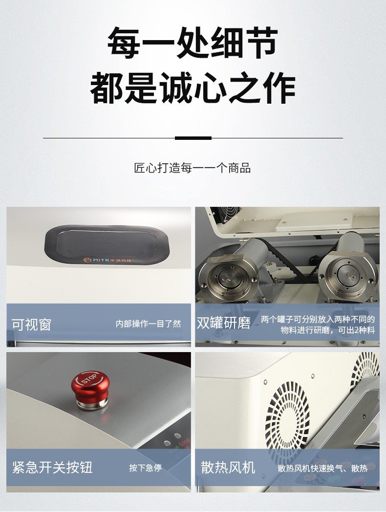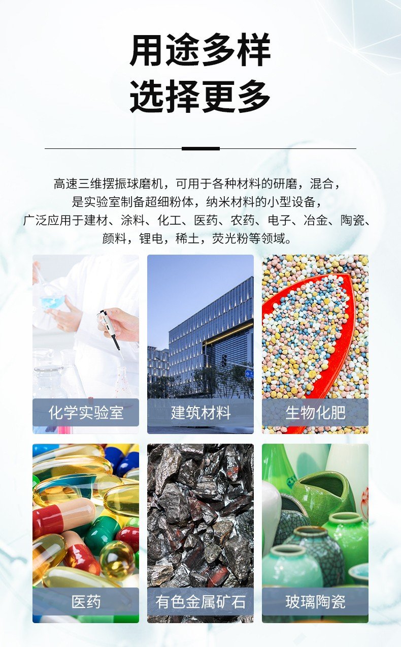 双罐高速三维摆振,可用于各种材料的研磨、混合、是实验室制备超细粉体。纳米材料的小型设备,具备效率高、体积小、重量轻、价格低等优点。