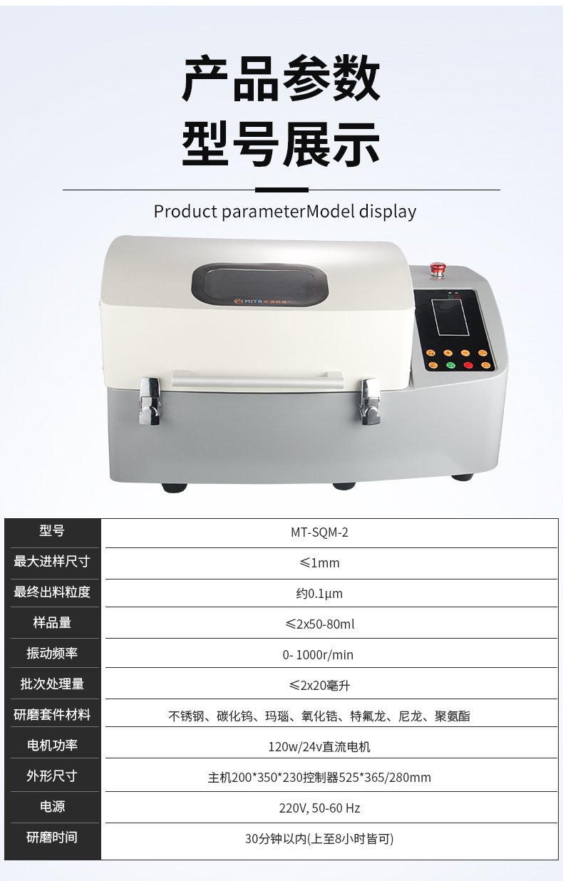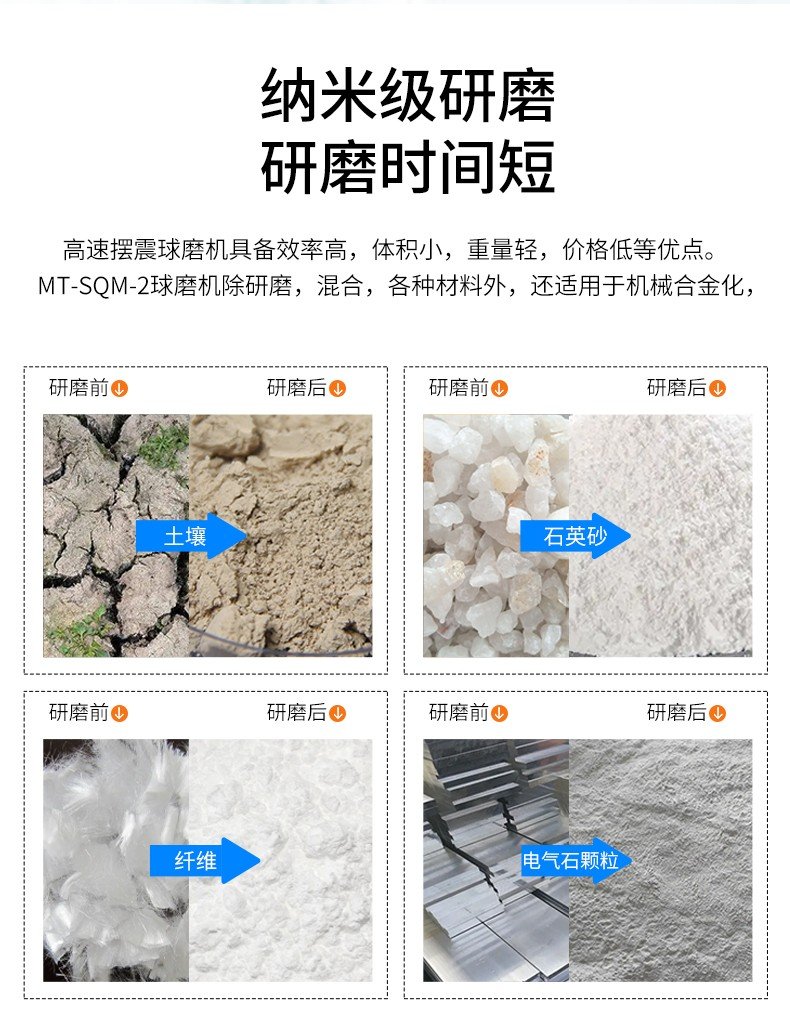 MT-SQM-2球磨机除研磨、混合、各种材料外,还适用于机械合金化,几种金属或者非金属的粉末或颗粒,在高能球磨过程中反复混合、破碎和冷焊,在球磨中逐渐细化,并在固态下形成合金相的核,使过去传统熔炼工艺难以实现的某些物质在球磨过程中实现合金化。