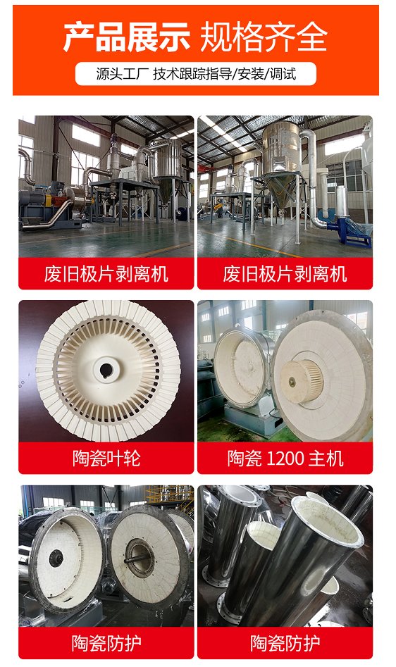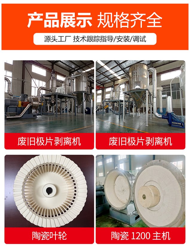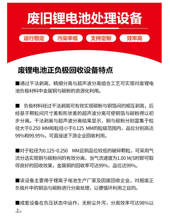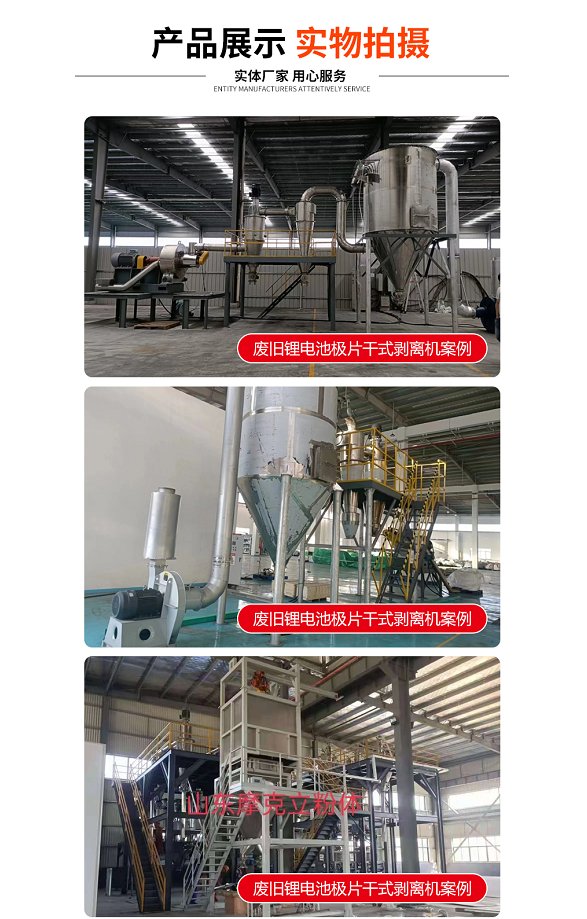 废旧锂电池极片打粉机,由剥离系统和分级系统组成,剥离系统将废旧锂电池极片上铝箔与黑粉进行分离,黑粉中铝含量控制在100-500PPm,回收率可达98%