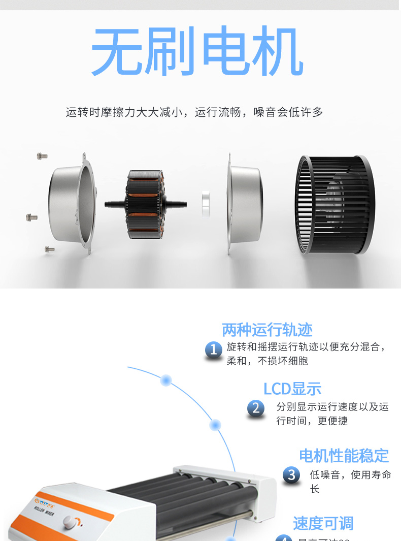 滚轴混匀仪采用直流无刷电机和微电脑控制技术.操作简单易用,能够对各 类常用试管进行滚动摇摆混匀.滚轴混匀仪特别适用于血液、粘性液体和液固悬 浮液等混合.