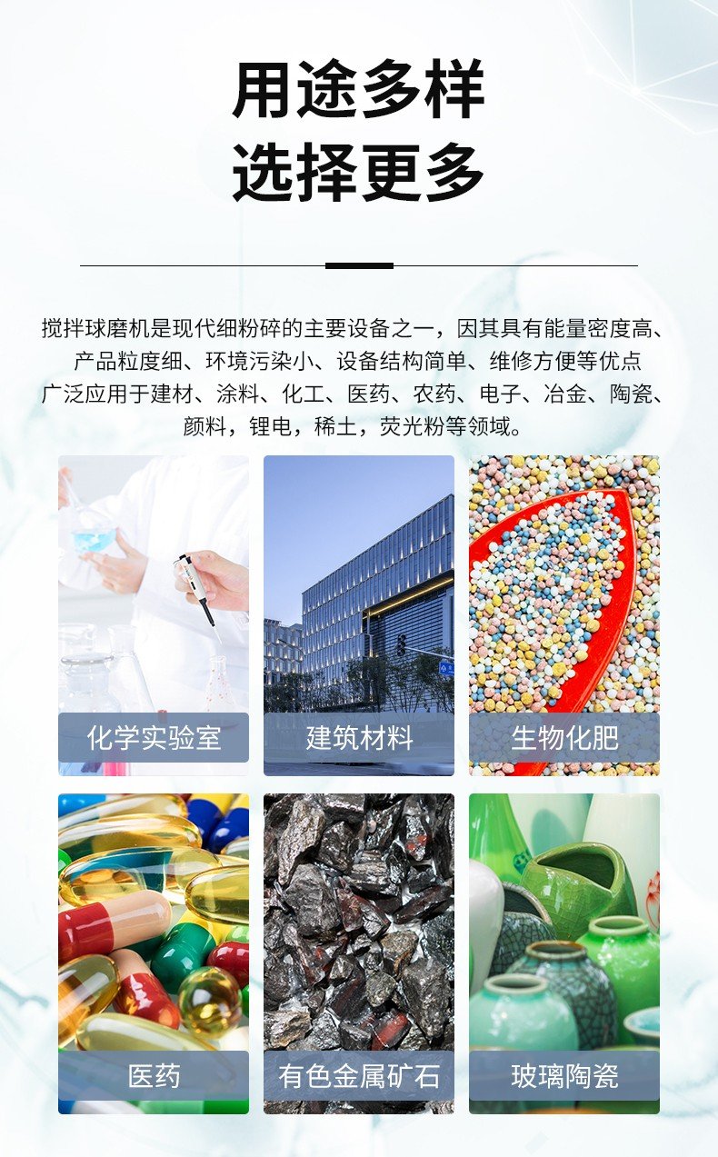 盖板、搅拌主轴、搅拌棒、磨筒均为不锈钢材质或耐磨聚氨酯材质。磨筒体积:0.5.1,2,3,5L;磨筒磨筒转速:1400或2800r/min或可调电机功率:250W-1250W;进料粒度:小于20mm.出料粒度:可达1微米 适应磨介:玻璃、刚玉、锆珠、钢珠,聚氨酯等