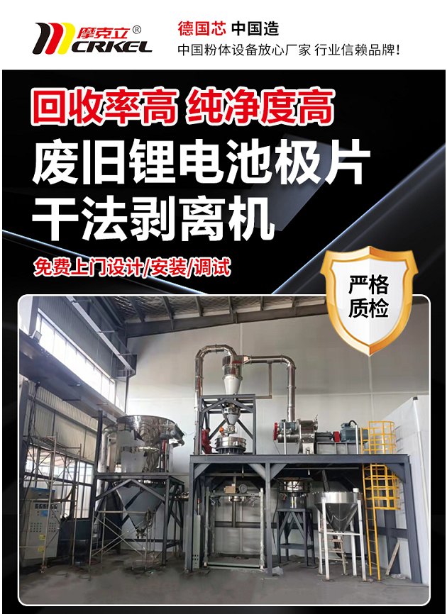 这套锂电池极片处理设备可处理不同规格的干性锂电池正负极材料,自动化程度高,主要工序由输送机-撕碎机-粉碎机-负压出料输送装置-筛分装置等组成成熟的生产线,提高了金属箔片和黑粉的回收率。