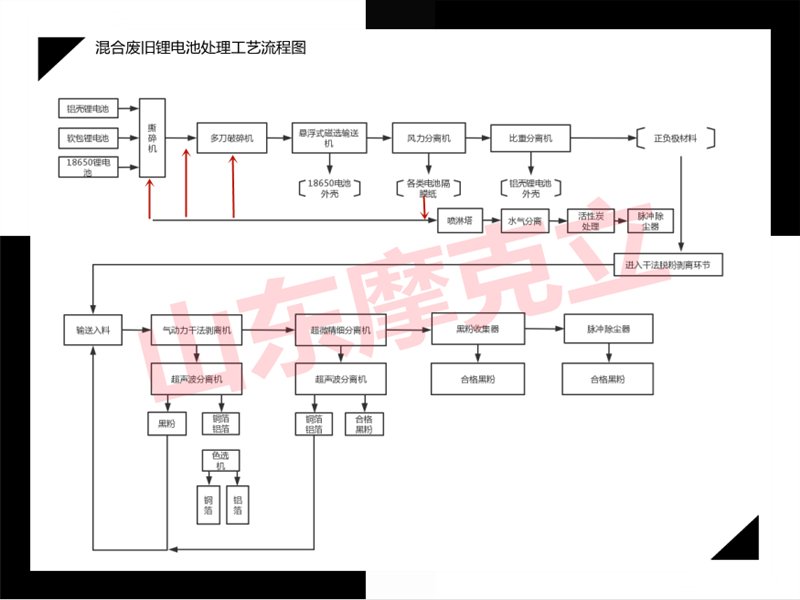 废旧锂电池回收处理设备能够实现对废旧锂电池中的钴、镍、锰、锂及铜、铝的回收。废旧锂电池处理设备中分离效果主要取决于分选率和分选效果,生产流程中,精细分离是很重要的环节,山东摩克立经多次反复实验,*终成功的设计使物料提取纯度达到更高效果的分离机。提高了对于报废锂电池材料的回收率,充分发挥了废旧锂电池的经济效益。