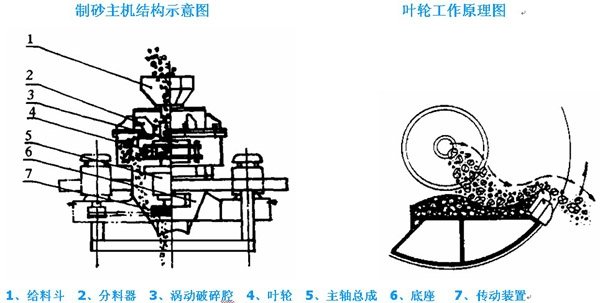 电机通过三角带带动中心立轴,使叶轮产生高速旋转。物料通过叶轮时产生高速离心运动,使物料获得动能,并高速射出,射出的物料在破碎腔得到粉碎。